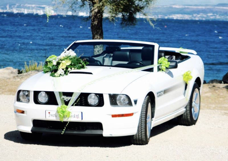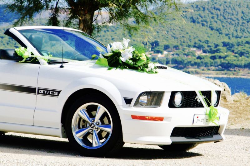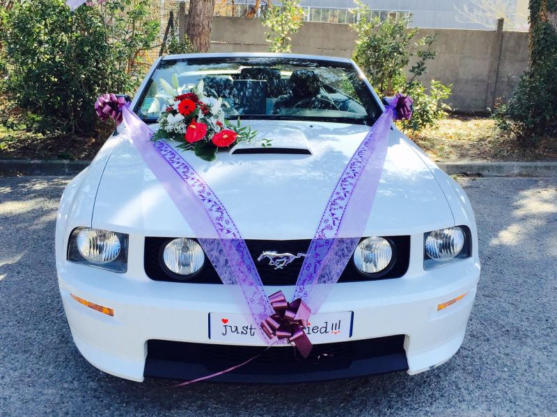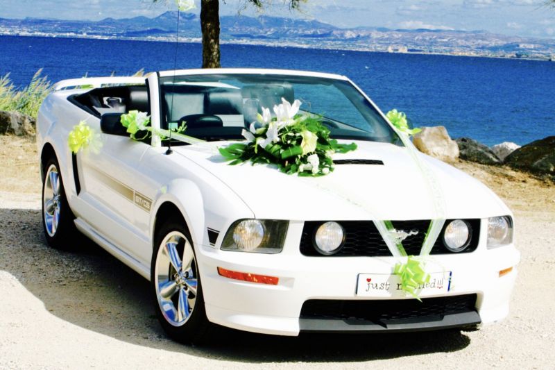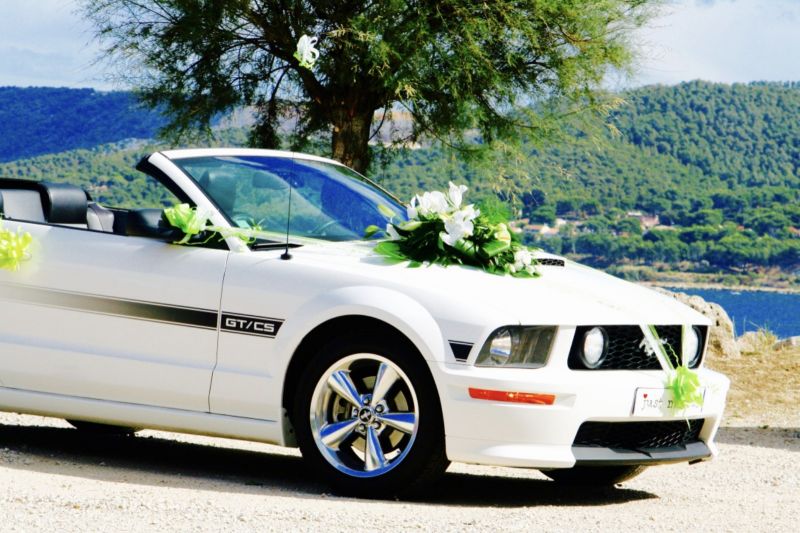 Location de voiture pour mariage en mercedes classe E noir équipé AMG, également disponible une magnifique Ford Mustang cabriolet blanche California Spéciale (CS/GT) de l'année 2007 cette version est une série limitée, tous les véhicules sont loués obligatoirement avec un chauffeur qui est inclut dans le forfait de la location.